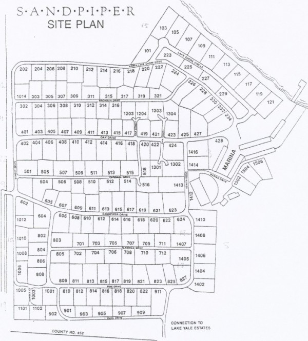 This is a map that shows the individual lots and gives street names. As you can see, house numbers are unique within the park. This means that if you know the lot number, you can find any home within the park without knowing the street name. The map is oriented with NORTH straight up.